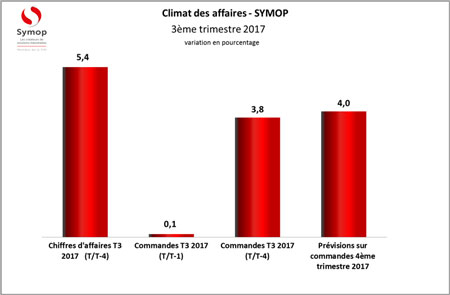 Les chiffres d’affaires ont progressé en moyenne de 5.4% par rapport au même trimestre 2016. L’activité du marché français reste soutenue (+5%), et les exportations connaissent une réelle amélioration (+7.5% après +6.8% au 2ème trimestre). Cela s’explique en partie par l’activité soutenue de l’industrie manufacturière européenne (28 pays) en hausse de 3.6% sur le trimestre. Les marchés asiatiques restent également très toniques.