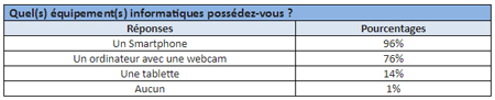 Afin de fournir ce genre de service à distance, les médecins doivent disposer du matériel informatique nécessaire. A ce titre, les médecins sont ultra équipés en informatique. Ainsi, plus de 96% des médecins possèdent un smartphone, plus de 76% un ordinateur avec webcam et 14% une tablette. Seulement 1% des médecins ne possèdent pas d’outils high-tech.