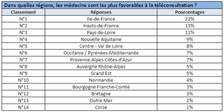 Les trois régions les plus favorables à la téléconsultation : Ile-de-France à 22%, Hauts-de-France à 13% et Pays-de-Loire à 11%.