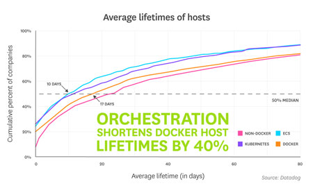 Au-delà du parc de conteneurs, l’orchestration intervient également au niveau de l’infrastructure sous-jacente. Au sein des clusters orchestrés par ECS ou Kubernetes, les hôtes ont une durée de vie moyenne d’environ 10 jours, contre 17 jours pour les hôtes Docker sans orchestration, et 23 jours pour les hôtes non-Docker. L’orchestration permet donc aux entreprises de se concentrer sur les services et charges de travail, et de traiter les hôtes comme des unités d’infrastructure consommables qui peuvent être automatiquement provisionnées ou détruites en fonction de la demande.