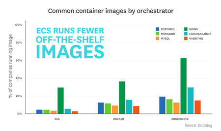 Au sein des clusters Kubernetes, on observe un large déploiement d’images de conteneurs pour les technologies d’infrastructures courantes telles que NGINX, Elasticsearch, and Postgres. Les mêmes images ont tendance également à apparaitre en environnements Docker non orchestrés, bien qu’en moindre quantité. Mais au sein des clusters ECS, l’étude montre une très faible adoption des images courantes de conteneurs publiquement disponibles. Il en résulte que de nombreux utilisateurs d’ECS ont probablement adopté des services AWS hébergés tels qu’Amazon RDS (Relational Database Service), Amazon ElasticSearch Service, et Amazon SQS (Simple Queue Service), plutôt que des services conteneurisés de ces composants d’architecture.