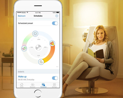 Les préréglages programmés peuvent être configurés en quelques secondes via l’application mobile WiZ disponible sur Google Play et l’Apple Store, mais aussi via la télécommande ou en utilisant l’activation vocale avec Google Play et Amazon Alexa. Grâce à la fonction Préréglages programmés, qui se trouve dans le menu Horaires de l’application, l’horaire de chaque pièce est représenté par un simple cercle sous la forme d’un cadran d’horloge, ce qui facilite la configuration, la gestion et la personnalisation du programme :