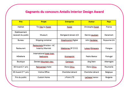 Destiné aux designers d’intérieur, architectes, imprimeurs, annonceurs et écoles de design, le concours Antalis Interior Design Award devait permettre aux participants d’exprimer librement leur créativité. Avec 342 projets publiés par des créatifs de 29 pays sur le site Antalis Interior Design Award, le pari est largement tenu !