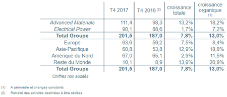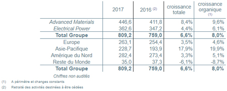 Les ventes du pôle Advanced Materials s’élèvent à 447 millions d’euros, en croissance organique de près de 10% sur l’année. La croissance des activités en électronique, aéronautique et solaire est particulièrement soutenue. Les industries de procédés sont restées également bien orientées tout au long de l’année. Après un bas de cycle atteint en 2016, le marché de la chimie contribue de nouveau à la croissance.