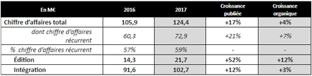 En outre, la part récurrente de l’activité progresse de +21%, plus rapidement que le chiffre d’affaires, pour représenter désormais 59% du revenu total (+2 pts versus 2016). Cet indicateur majeur traduit la transformation des modèles économiques innovants (souscriptions, SaaS) qui représentent plus de 11 M€ de chiffre d’affaires en croissance de +115 %, dont +12% en organique.