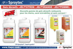 Une nouvelle gamme de gels abrasifs nettoyants d’origine naturelle : Dans le cadre du renouvellement de sa gamme de gels microbilles retirée du marché en début d’année 2018 afin de respecter le changement de législation relatif aux polluants (microbilles synthétiques), ITW Spraytec annonce le lancement d’une nouvelle gamme de gels abrasifs à usage professionnels pour les mains sous la marque JELT : « JELT’CITRON, JELT’ORANGE et JELT’POMME ».
