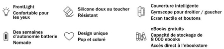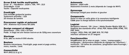 La liseuse SAGA est dotée d’un écran E-ink 6’’ Carta 1024x758 très agréable pour les yeux et intègre 4 boutons : page avant/arrière, un pour le menu et le dernier pour activer ou désactiver le FrontLight (rétro-éclairage de l’écran pour pouvoir lire dans le noir). Elle possède également un accéléromètre pour changer automatiquement la position droitier/gaucher, et sa couverture intelligente directement intégrée dans un tout-en-un élégant en silicone, allume et éteint l’appareil automatiquement. Enfin, une connexion wifi permet à l’utilisateur de télécharger des livres n’importe quand.