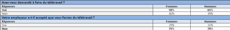 Pour palier à leur absence, beaucoup de Français ont demandé à pouvoir travailler à distance. Ainsi, 59% des femmes et 65% des hommes ont proposé à leur employeur l’option du télétravail. Malheureusement, peu de personnes ont pu bénéficier de cette alternative. En effet, 75% des femmes et 79% des hommes interrogés déclarent que le télétravail a été refusé par leur patron.