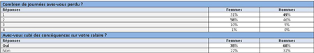 49% des hommes interrogés déclarent avoir perdu 1 journée à cause des intempéries quand les femmes sont 58% à en comptabiliser 2. Ces absences ont eu des répercussions sur les salaires pour 78% des femmes et 68% des hommes interrogés.