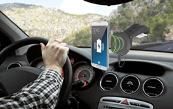 En voiture, Le chargeur sans-fil se fixe au pare-brise ou sur le tableau de bord. Il permet ainsi à l’automobiliste de pouvoir suivre la route sur son GPS tout en chargeant son smartphone.