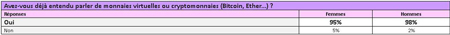 Pratiquement tous les Français connaissent aujourd’hui l’existence des monnaies numériques. En effet, plus de 95% des femmes et 98% des hommes interrogés ont déjà entendu parler des cryptomonnaies.