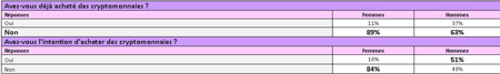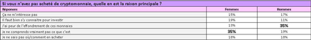 Les Français sont également divisés lorsqu’ils doivent expliquer les raisons pour lesquelles ils n’ont pas encore acheté de cryptomonnaies. Pour 35% des femmes c’est l’incompréhension de ces nouvelles monnaies qui domine alors que pour 35% des hommes c’est la peur d’un effondrement de ces devises virtuelles.