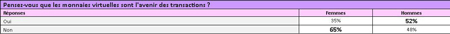 A la question "Pensez-vous que les monnaies virtuelles sont l’avenir des transactions ?", 65% des femmes interrogées répondent par la négative alors que plus de 52% des hommes déclarent que "oui".