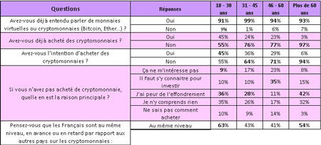 Beaucoup de choses changent également en fonction des âges. Ainsi, les Français entre 18 et 30 ans sont les plus enclins à acheter des cryptomonnaies avec plus de 45% de représentativité (contre 24% chez les 31-45 ans, 23% chez les 46-60 ans et 3% plus de 60 ans). De plus, les jeunes sont plus de 45% à avoir l’intention d’acheter des monnaies virtuelles (36% pour les 31-45 ans, 29% pour les 46-60 ans et 6% pour les plus de 60 ans). Les craintes conservent pratiquement les mêmes caractéristiques sans grande modification (méconnaissance et peur d’un effondrement). Enfin, pour la jeune génération des 18-30 ans l’avenir des transactions est clairement dans l’utilisation des monnaies virtuelles.