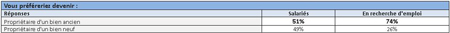 Pour le type d’habitat, la maison reste de loin le bien le plus recherché pour l’ensemble des personnes interrogées. Cependant, une nouvelle fois, les demandeurs d’emploi sont plus nombreux (79%) à espérer acquérir une maison que parmi les salariés (59%). Les personnes en activité sont également plus attirées par un appartement (35%) alors que les demandeurs d’emploi ne sont que 17% dans cette éventualité.