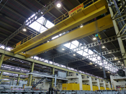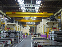 Les derniers ponts bipoutre assurent une hauteur de levage de 9,8m, pour une portée totale de 21,8 m. Chaque poutre est installée à des emplacements différents dans l’atelier d’emboutissage. Les sommiers sont équipés de dispositifs anticollision/ralentissement qui éliminent la possibilité de contact entre le système et un pont adjacent en coupant l’alimentation dès qu’ils ne sont plus qu’à une certaine distance l’un de l’autre.