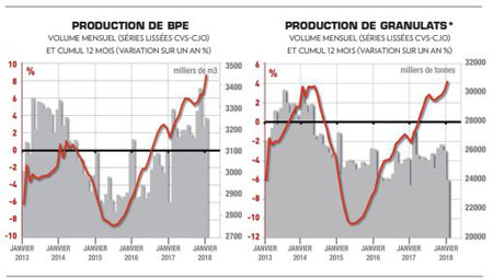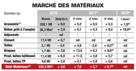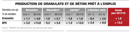 Ainsi, en janvier, l’activité granulats aurait affiché une baisse de - 7,8 % par rapport au mois de décembre (données cvs-cjo) et une hausse de + 1,6 % par rapport au mois de janvier 2017, particulièrement bas en raison d’intempéries hivernales. Sur les trois mois de novembre à janvier, l’activité se stabilise par rapport aux trois mois précédents (- 0,4 %) mais reste en hausse de + 2,6 % au regard du même trimestre d’il y a un an. Signe que la demande est restée vigoureuse, les livraisons de BPE ont malgré tout affiché une hausse de + 1,2 % par rapport à décembre et de + 13,5 % par rapport à janvier 2017 (certes très bas), certaines productions en “bord à quai” ayant pu être transférées sur des sites “terrestres”. Sur les trois derniers mois, les livraisons de BPE demeurent nettement haussières, de + 2,4 % par rapport aux trois mois précédents et de + 9,8 % sur un an.