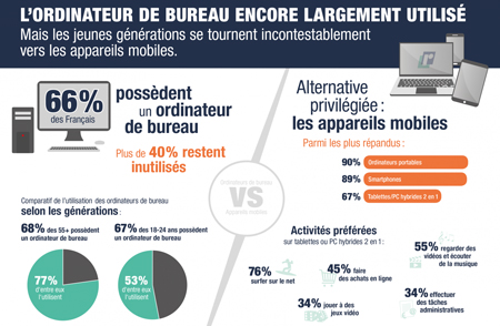 Les ordinateurs de bureau sont-ils en train de vivre leurs dernières heures ? Alors que les ordinateurs portables et les smartphones sont plébiscités par les Français (90% et 89% d’utilisateurs respectivement), et que les tablettes et les PC hybrides 2 en 1 conquièrent de nouvelles parts de marché, reichelt elektronik s’interroge sur l’utilisation des ordinateurs de bureau. Obsolescence totale ou utilisation soutenue, c’est l’objet de la dernière étude menée par OnePoll pour reichelt elektronik.