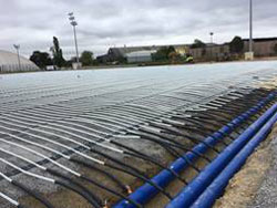 REHAU propose donc la mise hors gel du terrain lors de températures basses grâce à son système de chauffage par le sol à l’image de celui posé dans les bâtiments tertiaires et maisons d’habitation. Le tube PE-Xa est ainsi mis en place sur toute la surface du terrain et associé à un collecteur en polyéthylène PE. Par l’intermédiaire d’un tube RAUVITHERM, celui-ci est relié à une chaufferie qui va permettre la montée en température du réseau d’eau parcourant le terrain et ainsi assurer la mise hors gel. Lorsqu’il fera -10°c à l’extérieur, la température au-dessus de la pelouse sera de +2°C. Cette solution permet à la fois de jouer toute l’année sans craintes de blessures pour les joueurs, mais aussi de préserver la qualité du terrain, qui ne subit pas les aléas météorologiques et reste donc toujours souple.