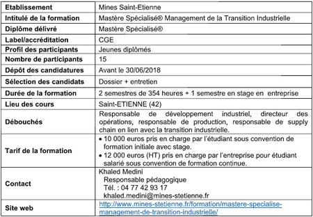 Ce MS® forme des ingénieurs capables d’entrainer le processus de transition en accompagnant les entreprises à produire autrement, à gagner en réactivité et en compétitivité. De la conception à la fin de vie en passant par la production et la logistique, sur l’ensemble de la chaîne de valeur et en prenant en compte toutes les parties prenantes, les Managers de la Transition Industrielle sauront moderniser et transformer le modèle industriel et ainsi participer à réaffirmer la place de la France au meilleur rang mondial dans le secteur de l’industrie.