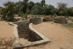 Le puits maraîcher est équipé d’une motopompe pour faire remonter l’eau dans les bassins, qui eux-mêmes alimentent les tuyaux pour irriguer les grands jardins où sont produits fruits, légumes, condiments et céréales.