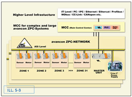 Une interface maître AS peut contrôler et surveiller un maximum de 31 zones du système ZPC. Si nécessaire, le réseau ZPC interne peut également être équipé d’un MCC (Main Control Center = commande centrale) qui dispose d’une unité de traitement préprogrammée (CLP) et d’une passerelle modulaire vers presque tous les systèmes bus/TI de niveau supérieur. Généralement, Avancon recommande le MCC pour des installations plus importantes et plus complexes. Il englobe tous les appareils maîtres du réseau ZPC et peut également exécuter de nombreuses autres fonctions. Ainsi, il n’y a aucune restriction quant à la taille du système de flux des matières.