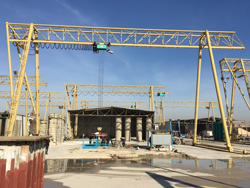Hydro-Aménagement a choisi VERLINDE, dans le cadre d’un appel d’offre, pour un projet de rénovation d’un site de fabrication de tuyaux frettés en béton 2 mètres de diamètre pour l’acheminement de l’eau. L’installation extérieure existante, des portiques de marque SWS qui dataient des années 80, était très ancienne et dégradée par les 30 années passées en environnement extérieur. Hydro-Aménagement souhaitait, outre rénover son outil de production, réduire les temps d’intervention ainsi que les nombreux arrêts de production dus à la vétusté du matériel. Les portiques sont utilisés pour la manipulation des coffrages des tuyaux, puis après séchage et décoffrages, pour leur chargement. La charge à manipuler est à la fois lourde et fragile, cela nécessite une installation d’une capacité de levage 32 tonnes pour une hauteur maximale de 17 mètres. Les portiques sont motorisés en translation et circulent sur des rails.