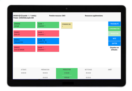 L’interface présente une version simplifiée d’un ordre de travail avec les ressources associées (hommes et machines) et les produits finis ou semi-finis (quantités, liste des composants...). Les actions possibles sont représentées par des boutons sur l’interface d’accueil (traçabilité, consommation, production, note, quitter…).