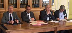 La convention qui scelle l’entrée de Mines Saint-Etienne dans la chaire a été signée le 23 avril à l’Ecole des Mines de Saint-Etienne en présence de Dominique Letourneau, Président du Directoire de la Fondation de l’Avenir, Maurice Ronat, Président d’EoviMcd mutuelle, de Rémi Bouvier, Directeur Général d’EoviMcd Santé et Services et Trésorier de la Fondation de l’Avenir, Pascal Ray, Directeur de Mines Saint-Etienne, David Delafosse, Directeur de la Recherche et de l’Innovation de Mines Saint-Etienne, et de Vincent Augusto, Enseignant-Chercheur au Centre Ingénierie Santé de Mines Saint-Etienne.