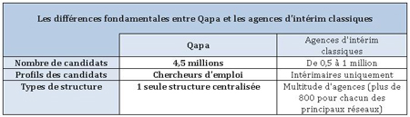 « Aujourd’hui, le positionnement de Qapa sur l’intérim permet de proposer des prix inégalés grâce à une structure de coûts ultra légère. Nous avons acquis depuis 2011 d’énormes capacités d’approvisionnement en profils en tirant parti de la base de candidats propriétaires de Qapa soit plus de 4,5 millions de membres ainsi qu’une intense activité sur les réseaux sociaux. Nous pouvons recruter des profils disponibles en moins de 2 heures, en s’occupant de toutes les démarches pour l’entreprise. Nous sommes de plus particulièrement fiers de constater que plus d’un tiers des candidats de Qapa sont embauchés de façon permanente après 3 mois de travail temporaire ». Stéphanie Delestre, fondatrice de Qapa.fr