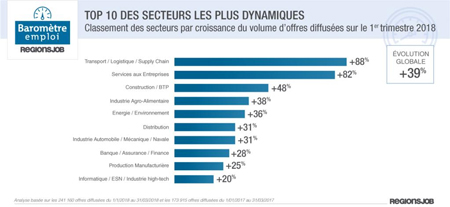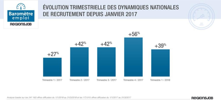 Le groupe RegionsJob, fort de son statut de second acteur privé de l’emploi et du recrutement en France vous dit tout de l’emploi en ce premier trimestre 2018 : en quelques mots, tous les voyants sont au vert ! Après une année 2017 à +41% la croissance des offres d’emploi continue de plus belle avec un 1er trimestre en hausse de 39% par rapport à la même période en 2017.