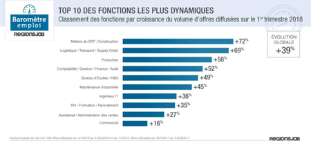Il y a des choses qui ne change pas, et c’est le cas pour la dynamique que connaissent les métiers du BTP et de la construction. En effet, après un quasi doublement des offres en 2017, ces fonctions connaissent une croissance de 72%. Espérons que l’adage « quand le bâtiment va tout va » soit toujours vrai… On retrouve en deuxième position les métiers de la logistique et du transport avec (+69%). Autre bon signe de la reprise et notamment industrielle, les postes en Production arrivent 3ème avec +58% d’offres.