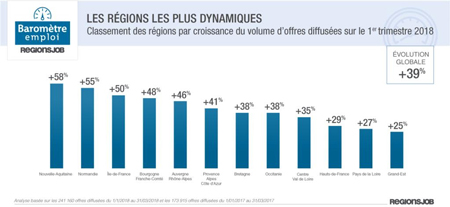 Les 3 millions de visiteurs uniques mensuels (Septembre 2017) et les 80 000 offres diffusées chaque mois par plus de 10 000 recruteurs sur l’ensemble de ses plateformes et du territoire permettent au groupe RegionsJob de proposer un éclairage sur les dynamiques de l’emploi en France. En comparant le nombre d’offres d’emploi diffusées au 1er trimestre 2018 avec la même période en 2017, le groupe RegionsJob propose une analyse complète de l’évolution de l’emploi : Dans le détail, RegionsJob révèle quelles régions et métropoles ont été les plus dynamiques ? Quels secteurs recrutent le plus ? Quelles fonctions sont les plus recherchées ? Quels types de contrats ?