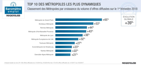 La métropole du Grand Paris est une nouvelle fois leader incontesté de ce classement avec une hausse de 65% en volume d’offres par rapport à l’an passé (après +66% en 2017). Trois métropoles surperforment la tendance nationale : Bordeaux Métropole (+53%), Rennes Métropole (+44%) et la Métropole d’Aix-Marseille-Provence (+43%).