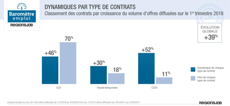 La confiance est au rendez-vous en ce début d’année 2018 : 70% des offres diffusées depuis janvier sont des CDI (en croissance de 46%) Les CDD sont également en hausse, de 52%, mais ces derniers ne représentent que 11% des offres proposées au 1er trimestre.