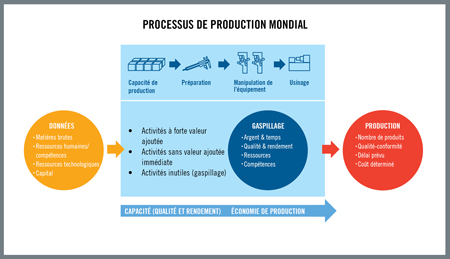 Le processus de fabrication commence par l’acquisition des matières brutes et la planification avec l’utilisation des compétences humaines, des ressources technologiques et des investissements. Le processus avance à travers la création de valeur ajoutée mais peut être freiné par des événements générateurs de déchets qui entraînent une perte d’argent, de temps et de ressources intellectuelles et réduisent ainsi la qualité et le rendement. Le rendement est mesuré en fonction de la qualité de la pièce, de la quantité requise, du temps de production souhaité et du coût.