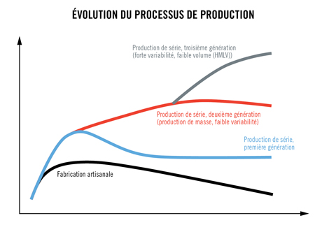 L’amélioration des méthodes de fabrication a ensuite débouché sur une deuxième génération de production de masse permettant de produire des volumes de plus en plus importants de pièces similaires (modèle de production de masse à faible variabilité (HVLM)). Plus récemment, la technologie numérique appliquée à la programmation, aux commandes des machines-outils et aux systèmes de manipulation des pièces a facilité la pratique d’une troisième génération de production qui permet une production de masse (HMLV) à forte variabilité et faible volume rentable.