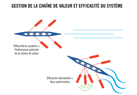 L’analyse de la gestion de la chaîne de valeur (VSM) illustre la nécessité d’équilibrer l’amélioration des performances entre tous les éléments du processus de fabrication. La figure 5 est une représentation graphique des effets de l’amélioration de la performance d’un seul élément d’un système. Imaginez plusieurs personnes dans un aviron. Si l’un des rameurs était beaucoup plus performant que les autres, cela nuirait à la performance globale de l’équipe.