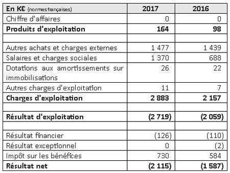 Après comptabilisation de 730 K€ de produit d’impôt, principalement du Crédit Impôt Recherche, le résultat net est négatif à hauteur de -2 115 K€ en 2017 contre -1 587 K€ en 2016.