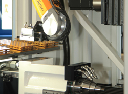 Grâce à leur principe de mesure inductif, les capteurs rotatifs HEIDENHAIN présentent des dimensions très compactes qui les prédestinent donc pour une utilisation à l’intérieur du bras robotisé où la place disponible est extrêmement réduite. En effet, Strausak tenait absolument à ce que le bras robotisé occupe le moins de place possible dans l’espace de la machine, un critère important lors du choix du fournisseur : "Nous voulions absolument intégrer le bras robotisé dans l’espace existant de la machine, déjà bien rempli. Il fallait pour cela que sa cinématique puisse permettre une totale liberté de mouvement dans un volume très restreint. Le bras robotisé ne devait pas non plus limiter l’accès à la zone d’usinage en position de repos", explique Alexandre Condrau pour faire état de la complexité du cahier des charges.