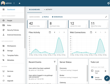 Avec l’introduction imminente de la réglementation générale sur la protection des données (RGDP), l’interface administrateur de Pydio Enterprise a été largement redéveloppée pour offrir clarté et contrôle, et simplifier la tâche de gestion des données pour la conformité.