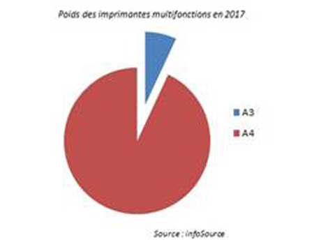 Les ventes de multifonctions en format A3 sont en recul de 6,8%. Cela s’explique par la baisse des ventes en jet d’encre et en toner Noir&Blanc ; alors que les placements couleur restent stables en B-to-B.