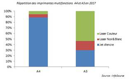 Le volume des ventes des multifonctions en format A4, majoritairement vendues sur le marché du grand public B-to-C, croit de 2,7% par rapport à 2016, porté par les ventes de jet d’encre qui représentent 88% des ventes totales. Le jet d’encre progresse de 4% et le laser (toner) régresse de 7% du fait de la décroissance sensible du Noir&Blanc - 18% compensée partiellement par la forte croissance de la couleur à 8%. En 2017, nous constatons, pour la première fois, autant de placements couleur que Noir&Blanc avec une dynamique de croissance soutenue pour la couleur qui va aller en s’accentuant.