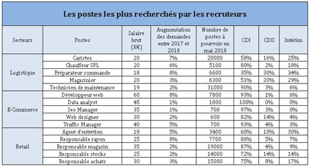Dans les trois secteurs clés, les postes qui sont de plus en plus demandés et qui enregistrent 8% d’augmentation par rapport à 2017, sont les préparateurs de commande pour la logistique, les développeurs web pour l’e-Commerce et les responsables rayon pour le secteur du retail. Cependant, les postes qui sont le plus en pénurie de profils sont en logistique avec les techniciens de maintenance et plus de 31.000 postes à pourvoir ainsi que les caristes avec 20.000 postes. En troisième position arrivent les responsables magasins avec 19.000 postes à pourvoir dans le secteur du retail.