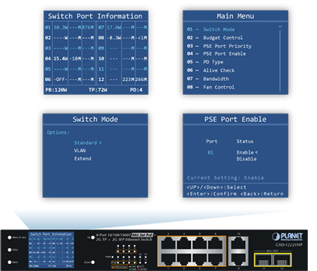 Le PLANET GSD-1222VHP fournit un panneau couleur intuitif en face avant qui facilite la gestion Ethernet et la gestion PoE PD. Ils favorisent grandement l’efficacité de la gestion dans les réseaux à grande échelle pour les entreprises, les hôtels, les centres commerciaux, les bâtiments gouvernementaux et d’autres espaces publics, et disposent de fonctions spéciales de gestion et d’état suivantes :