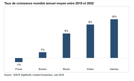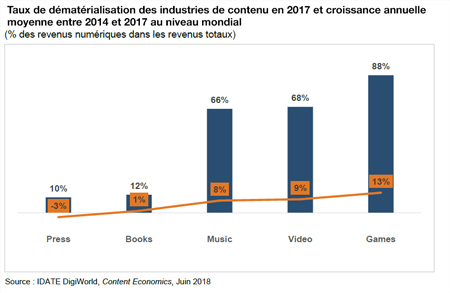 Le niveau actuel de dématérialisation des industries de contenus est extrêmement variable, de moins de 10 % des revenus de la presse à près de 90 % pour ceux du jeu vidéo proviennent de la consommation dématérialisée.