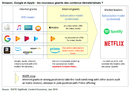 Les GAFA s’installent progressivement sur ce marché. Apple, Amazon et Google enrichissent progressivement leurs services, ajoutant le livre voire la presse aux offres plus traditionnelles de musique et de vidéo, passant de logiques de ventes et locations de contenus à celle d’abonnement, et proposant des terminaux adaptés à la consommation de leurs services de contenus.