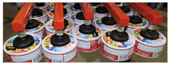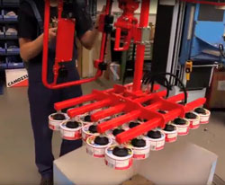 Grâce à un dispositif pneumatique adapté pourvu de ventouses, l’outil de préhension permet la prise et une manipulation aisées de 15 ou 34 boîtes de fromages regroupées en une seule charge.