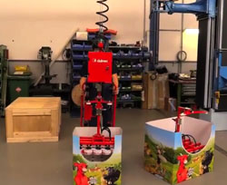 Le manipulateur « POSIFIL » a été notamment conçu pour évoluer dans les espaces réduits où il est quasi impossible de mettre en place un convoyeur pour acheminer les boîtes de fromages jusqu’à l’endroit de leur stockage en caisses carton.
