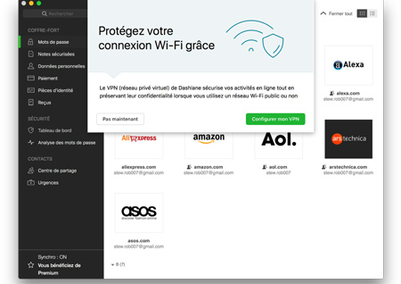Surveillance du dark Web avec alertes de sécurité personnalisées : Les utilisateurs Premium peuvent surveiller jusqu’à cinq comptes e-mail et recevoir des alertes de sécurité détaillées lorsque Dashlane trouve que leurs données personnelles sont sur le dark Web. Ce service efficace analyse plus de 32 milliards de rapports concernant des piratages et failles de sécurité.